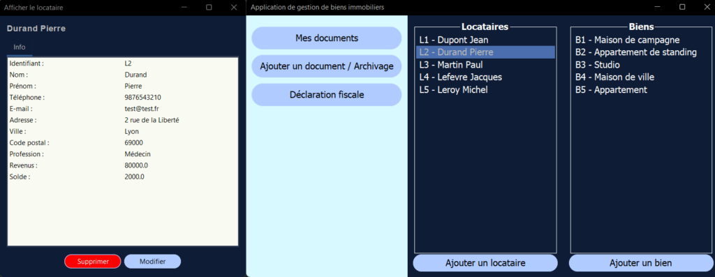Dans le cadre d’un projet universitaire réalisé à 4, j’ai développé une application de gestion immobilière. Elle permet de visualiser, ajouter ou supprimer des locataires, des biens, des baux et également d’autres fonctionnalités relatives.