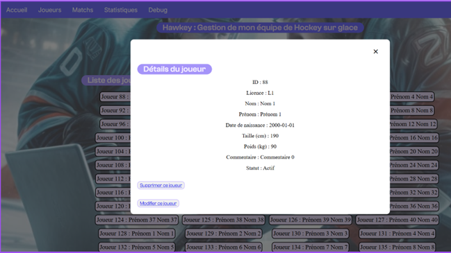 Hawkey est une application web pour gérer son équipe de sport, et a été réalisé avec mon binôme dans le cadre de la formation. Elle comprend des fonctionnalités autour des joueurs et des matchs et des statistiques.